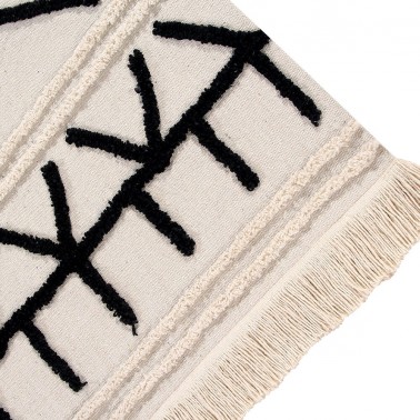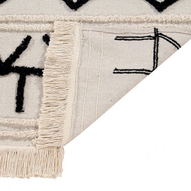 La base es de algodón reciclado y sin teñir como un lienzo en el que diversas líneas tejidas con algodón reciclado de color negro y color natural dibujan cenefas y formas de inspiración étnica. La mayor parte de la base queda visible y ocupa mucho menos espacio. Los extremos quedan rematados por flecos.
