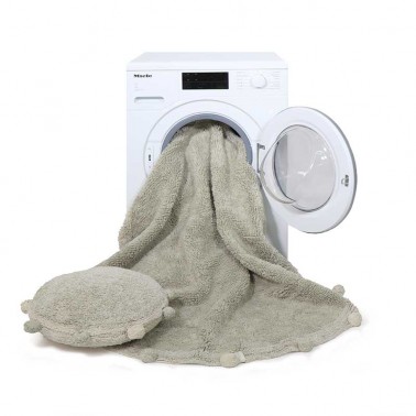 Este modelo está realizado en color oliva con borde en color natural y pompones de algodón alrededor.