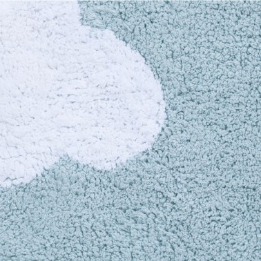 Pequeña y lavable con la forma de la silueta de una nube, tejida con suave pelo de algodón azul cielo, con una nube blanca más pequeña en el costado.