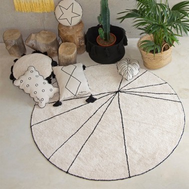 Alfombra redonda 100% algodón, lavable en lavadora doméstica (7 kg) que por su diseño, forma y color, encaja en cualquier estancia desde habitación infantil para bebé, niña y niño hasta para salón, dormitorio, recibidor, terraza o jardín.