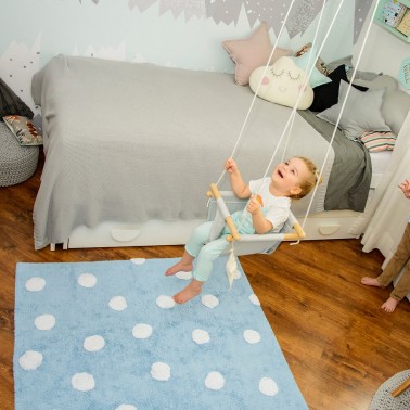 Alfombra LAVABLE en lavadora de la colección TOPOS en color azul con topos blancos.
