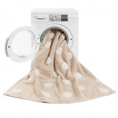 Alfombra LAVABLE en lavadora de la colección TOPOS con base en color crema y topos blancos.