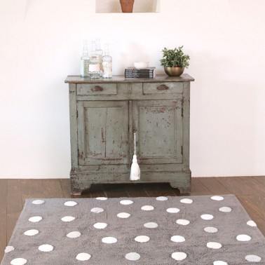 Alfombra LAVABLE en lavadora de la colección TOPOS en color gris y topos blancos.