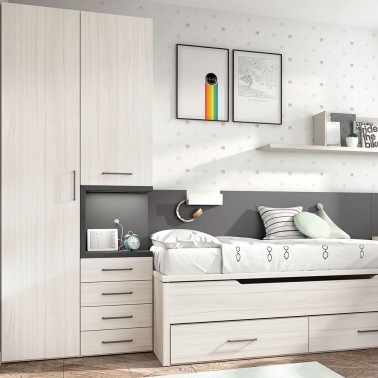 Armario para habitación infantil o juvenil con una puerta y cuatro cajones en la parte inferior y un cubo abierto en el centro.