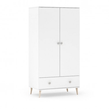 Un armario de dos puertas y cajón inferior con patas de madera. Color y tiradores a elegir.