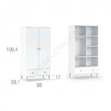Dos puertas frontales. Distribución interior con baldas y barra de colgar y cajón inferior con cierre amortiguado y guías ocultas.