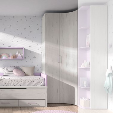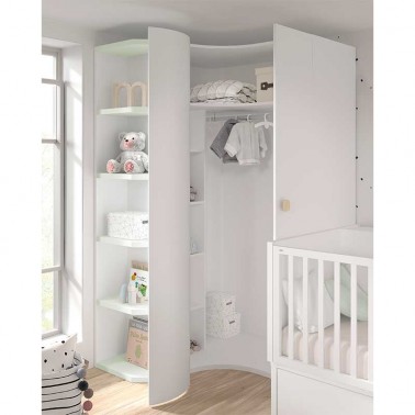 Armario de rincón para habitación infantil, con una puerta curva y una puerta batiente recta. Incluye estantería interior. Incluye barra de colgar.