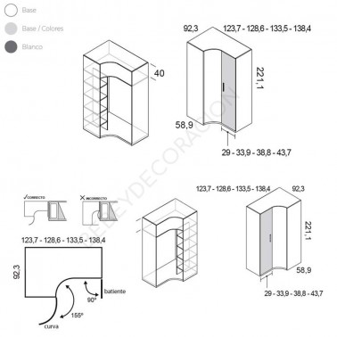 Armario rincón con dos puertas , una de ellas es curva, en varias opciones de medidas y acabados.