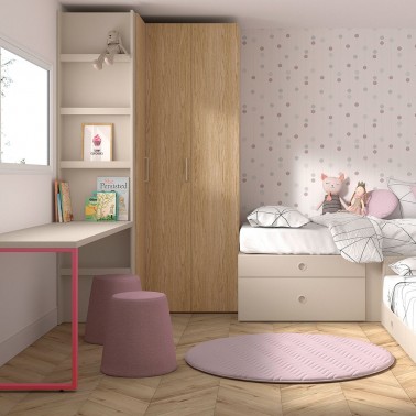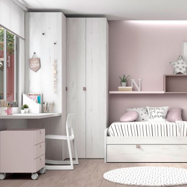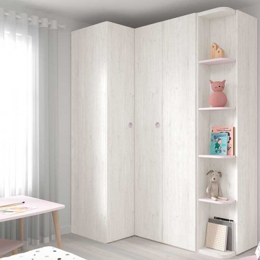 Armario de rincón para habitación infantil, con una puerta batiente y dos puertas plegables. Incluye estantería interior y barra de colgar.