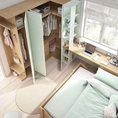 Armario de rincón para habitación infantil, con una puerta batiente y dos puertas plegables. Incluye estantería interior y barra de colgar.
