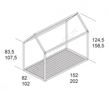- Para colchón de 90x190: 202 cm largo x 102 cm de fondo x 158,5 cm de alto