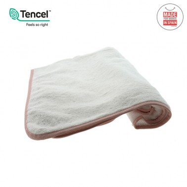 Esta capa de baño se diferencia del resto porque está elaborada con TECNEL, fibras botánicas y ecológicas que evitan la aparición de alergias e irritaciones. No retiene la cal del agua y se gana en suavidad.