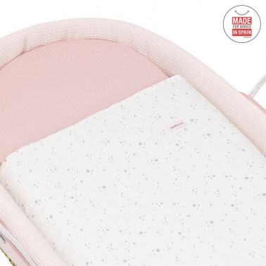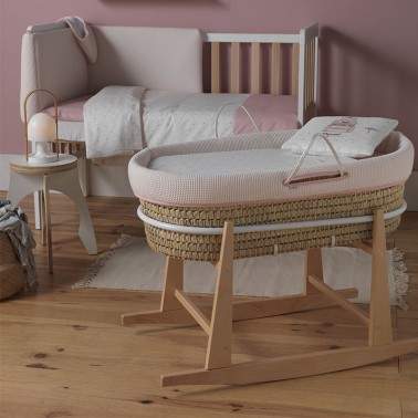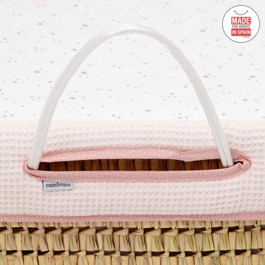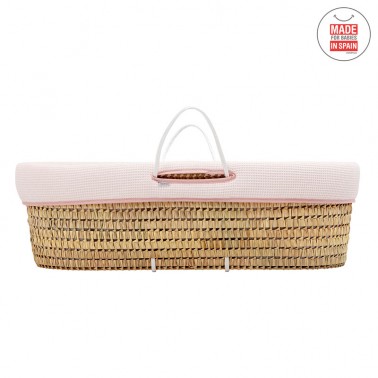 Capazo de palma acolchado para los primeros meses del bebé. Con la vestidura Sky rosa de Cambrass.