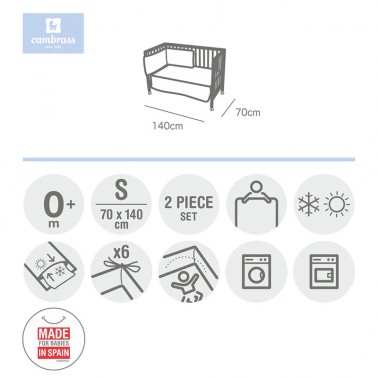 Disponible en dos medidas: para cuna de 60x120 y cuna de 70x140.