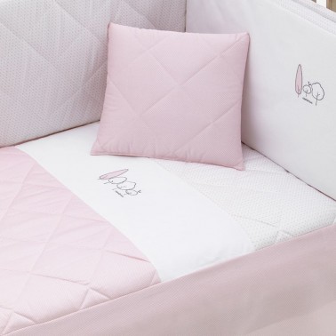 Pack de colcha con relleno desenfundable y protector de cuna para los barrotes. Incluye un cojín para decorar la cuna.