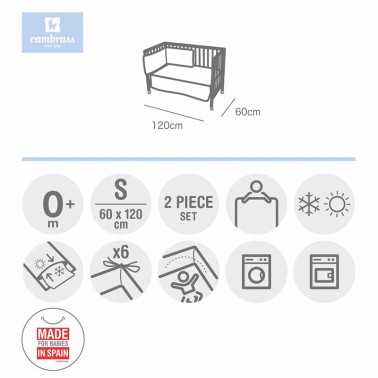Todo el juego está compuesto por tejidos algodón de 205 hilos, lo que hace una suavidad extraordinaria para estar en contacto con la piel de los bebes.