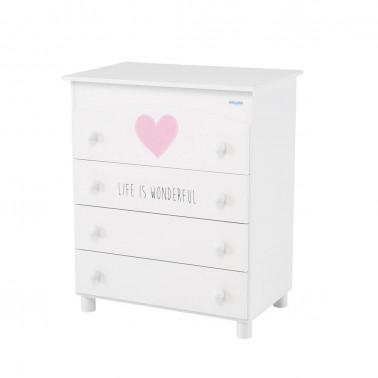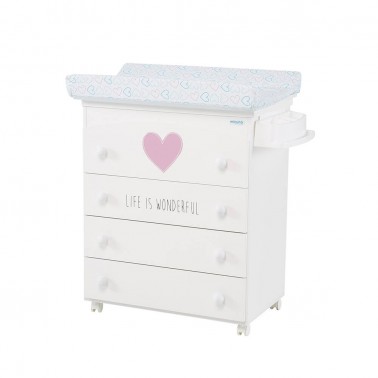 En la parte superior, incorpora un práctico cambiador de plástico, con un elegante tapizado de corazones de colores.