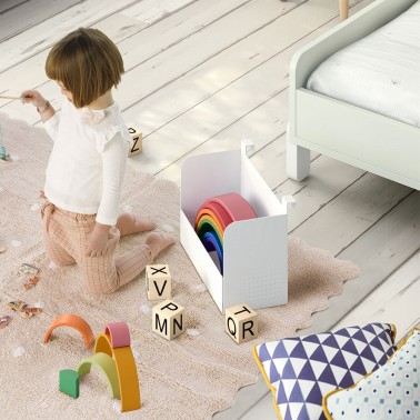 Pues con esta cubeta metálica Arco Iris será muy fácil que tu peque tenga sus tesoros más preciados, juguetes o libros cerca y a su alcance.