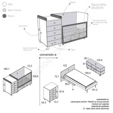 - La Barandilla abatible siempre es blanca y con barrotes en madera de haya natural. Patas en madera de haya natural. Los laterales del cambiador son blancos.