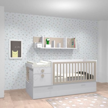 Cuna para bebé con módulo cambiador incorporado y que se convierte en una cama tipo tatami, un escritorio, una estanteria, un buk de dos huecos y un módulo con cajones.