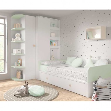 - En la desconversión se obtienen una cama de 90x190 con otra cama o cajones en la parte inferior, mesa de estudio, módulo de cajones y módulo diáfano para el escritorio.