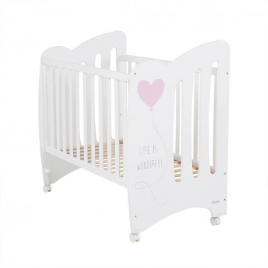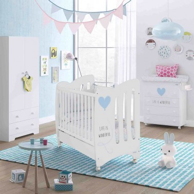 La cuna Wonderful de 120 x 60 cm está disponible en dos colores: tablero blanco con corazón azul y tablero blanco con corazón rosa.