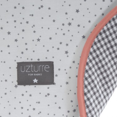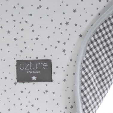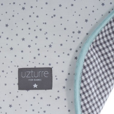 Estampado estrellitas en gris por un lado y vichy por el otro. Con ribete en color.