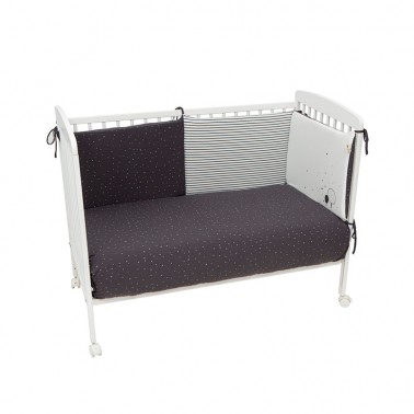 La suavidad del algodón orgánico en su cuna. Combina el blanco y el gris marengo con estrellitas.