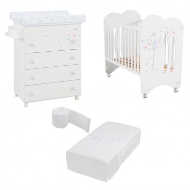 Pack de mobiliario y textil formado por cuna Aura, cambiador con bañera y textil para cuna.