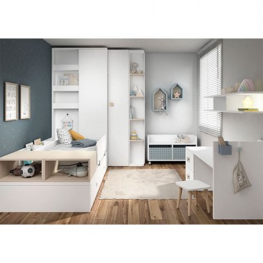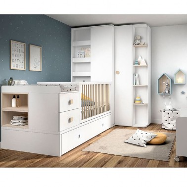 Habitación formada por cuna convertible, armario y dos books de casitas.