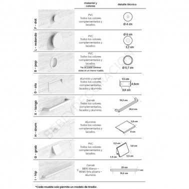 Colores utilizados Arizona, Óxido y Gris Arcilla y tiradores Drum color Gris Arcilla. Pero puedes elegir los colores que quieras entre los ofertados.