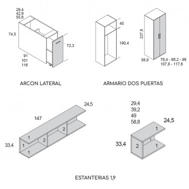 - Armario dos puertas de 98x58,9x237,8 cm que incluye la barra de colgar y altillo.
