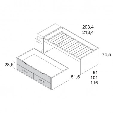 - Cama compacta ECO MIX con cama superior deslizable con brazos curvos, con larguero y de altura para arcón de 74,5 cm. La cama inferior también es deslizable y se incluye una cajonera fija de dos cajones. Cama superior para colchón de 90x190 y cama inferior para colchón de 180x90. No incluidos.