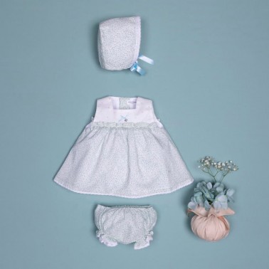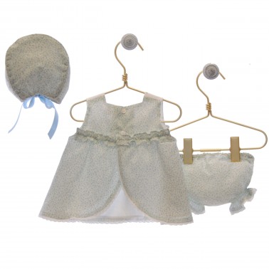 Conjunto para niña formado por jesusito en estampado liberty en verde empolvado, braguita y capota a juego.