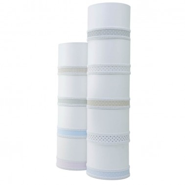 Pantalla cilíndrica en tejido chinz color blanco, detalle en lino y remate en galón blanco. Gran calidad. Varios acabados.