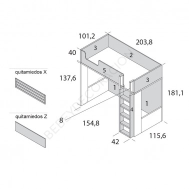 Medidas de la Litera Trak con espacio inferior libre y escalera frontal