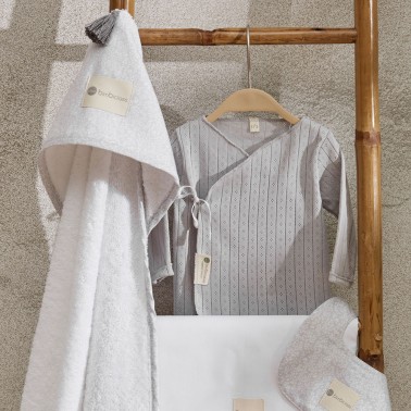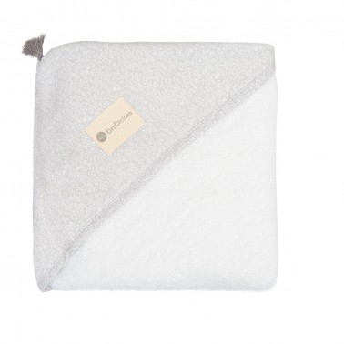 Capa en rizo de algodón 100%. con capucha en tejido piqué en blanco y gris , con detalles.