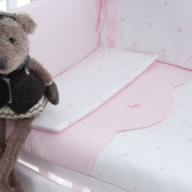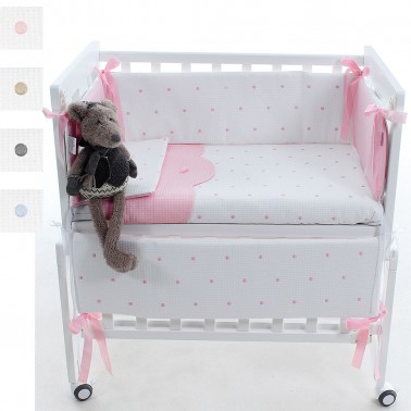 Vestidura en tejido piqué blanco, con bodoques bordados en azul, rosa, gris o piedra.