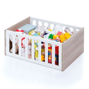 Es una minicuna evolutiva con 5 usos: Minicuna colecho y minicuna de los 0 a los 6 meses, sofá a partir del año, escritorio o juguetero a partir de los 2 años.