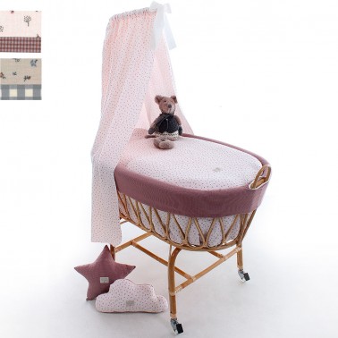 Minicuna de confección artesanal de ratán que incluye la vestidura textil modelo Catalina.