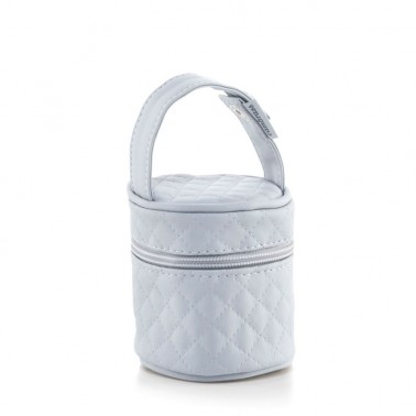 Un bonito portachupetes en polipiel con acolchado de rombos color celeste.