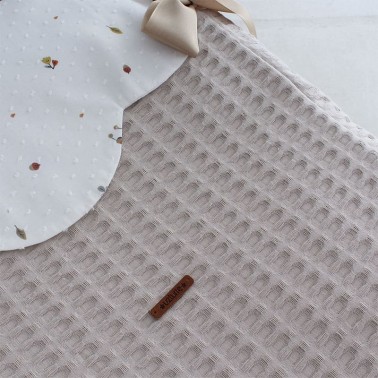 Saco para capazo en dos versiones: interior piqué gofrado 100% algodón orgánico o suave pelito. Embozo estampado gorritos y hojas.